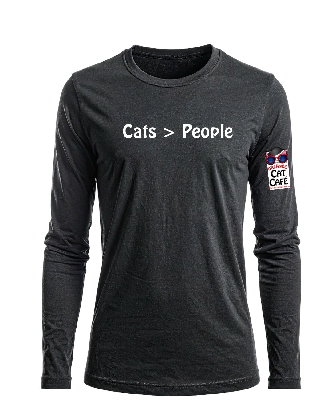 Our brand-new “Cats > People” long sleeve tee is perfect for anyone who proudly puts felines first. Made from 100% cotton, this shirt is soft, breathable, and comfortable enough for everyday wear—whether you’re visiting the café, volunteering, or just living your best cat-loving life. Orlando Cat Café logo is displayed on the sleeve. Available in Adult sizes S–2XL